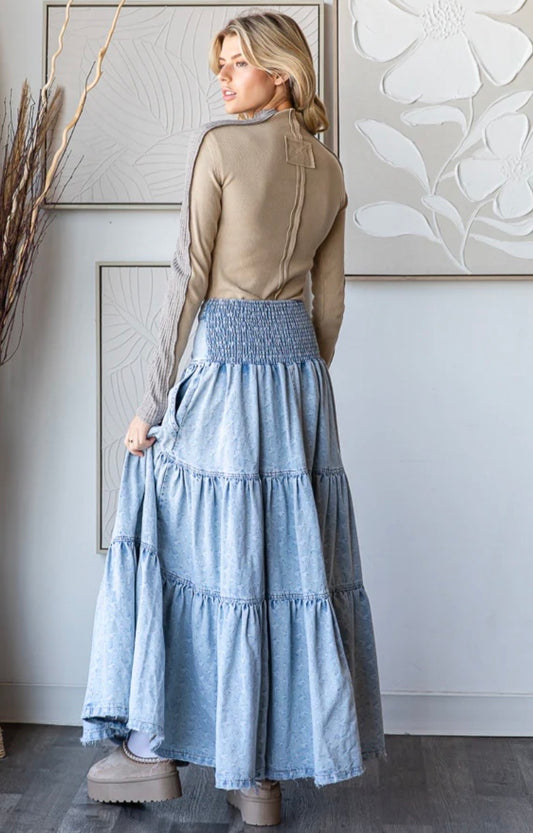 Washed Printed Maxi Tiered Denim Skirt