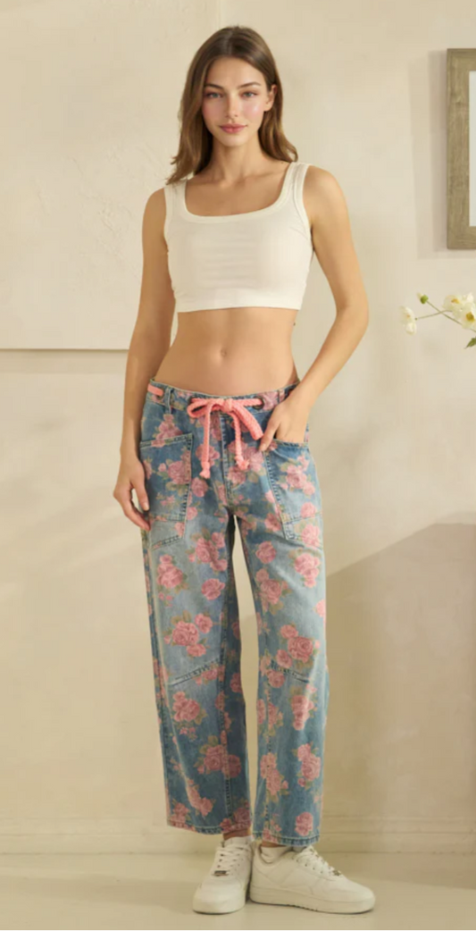 Washed Floral Barrel Jeans