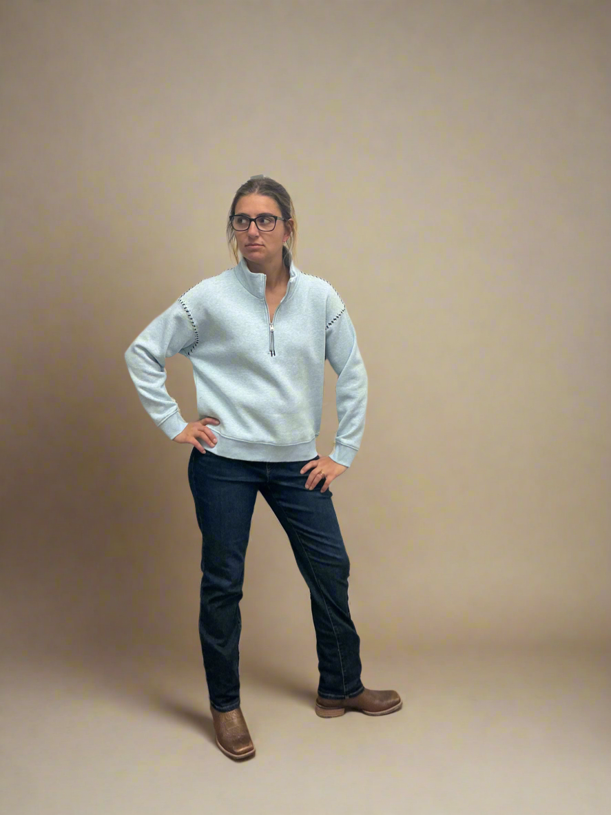 Wrap yourself in effortless comfort this fall with our light blue funnel neck pullover. Designed with soft cotton, this piece is lightweight yet warm-perfect for crisp autumn days. The funnel collar features a subtle zipper detail for style and versatility, while the cross-stitched design on the sleeves add a modern, playful touch. Incredibly soft and cozy, this pullover pairs effortlessly with jeans or leggings, making it a must-have for women with fashion, who want comfort without sacrificing style.