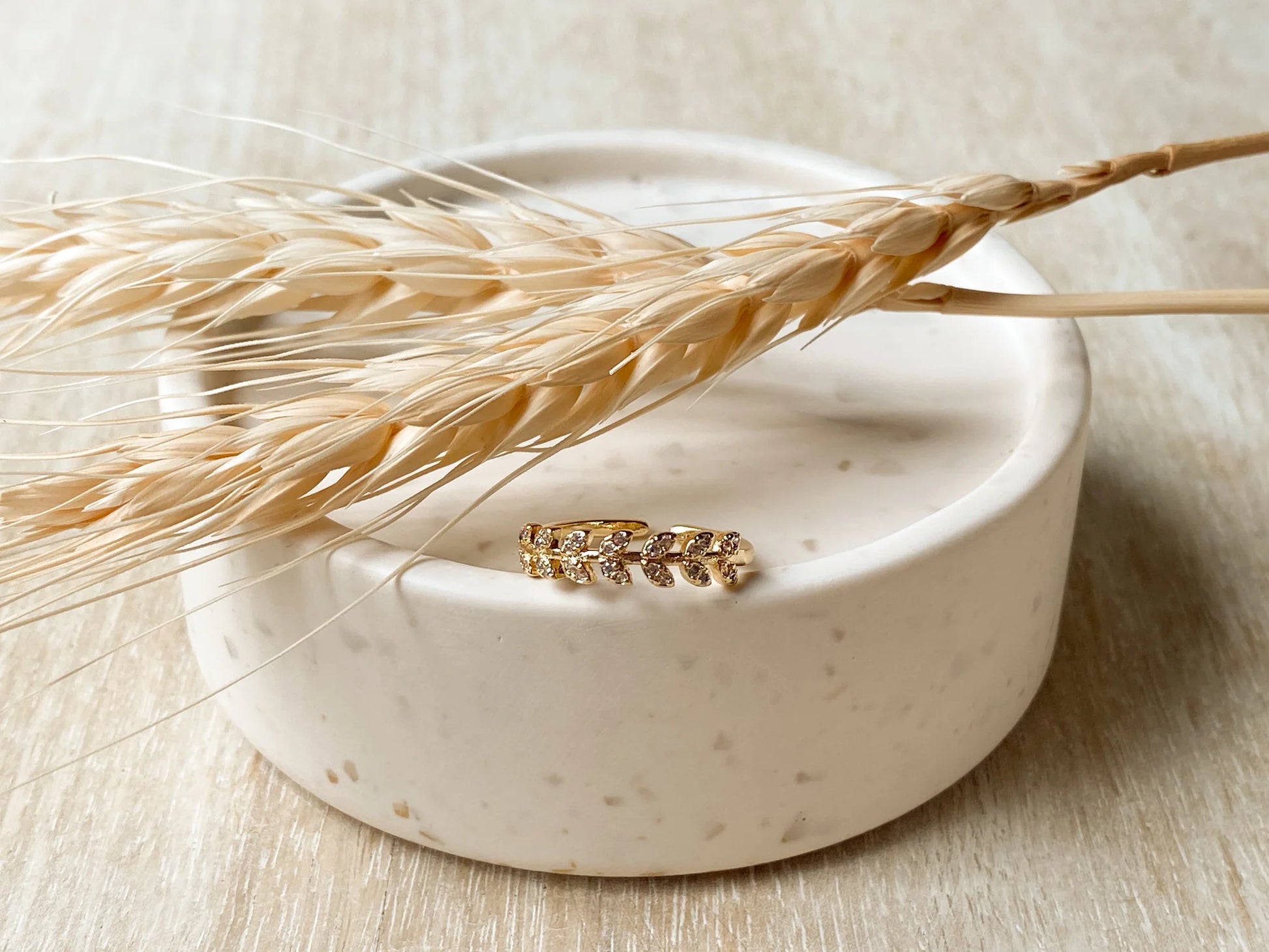 A unique nature inspired ring with cubic zirconia stones. Adjustable and 14K Gold plated.