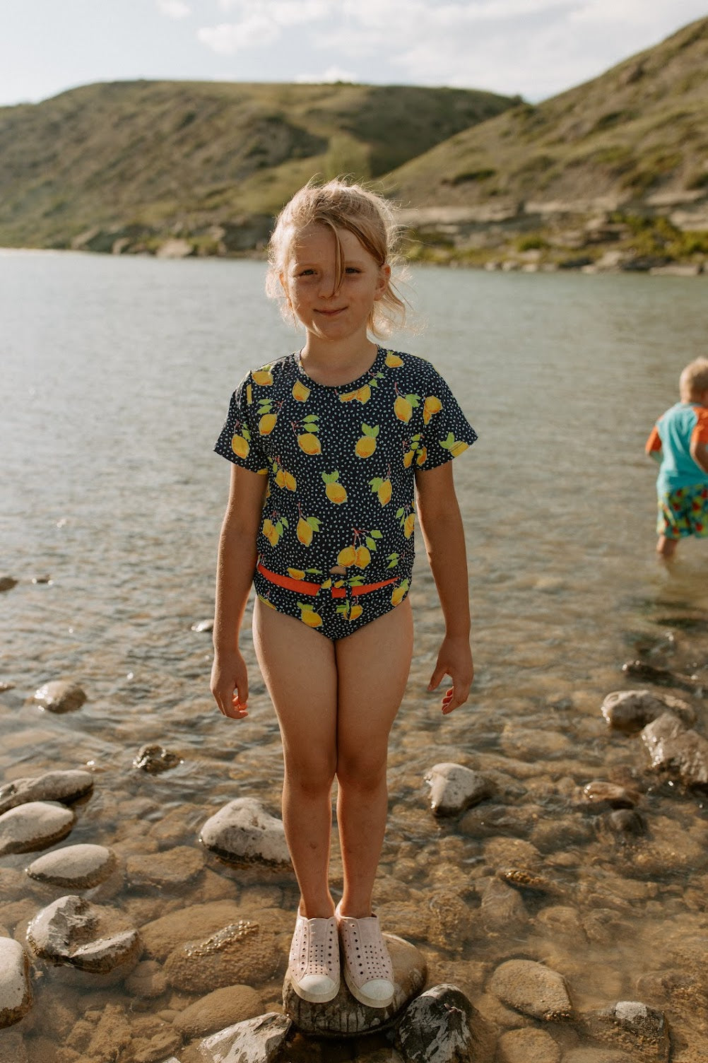 Add a splash of summer to her swimwear with this adorable tankini set! Featuring a cheerful fresh lemon print, the top includes a stylish tie knot detail for a playful touch. The matching swim bottoms are accented with a bold orange waistband, making this set as bright and fun as a sunny day at the beach. Perfect for poolside play or seaside adventures!