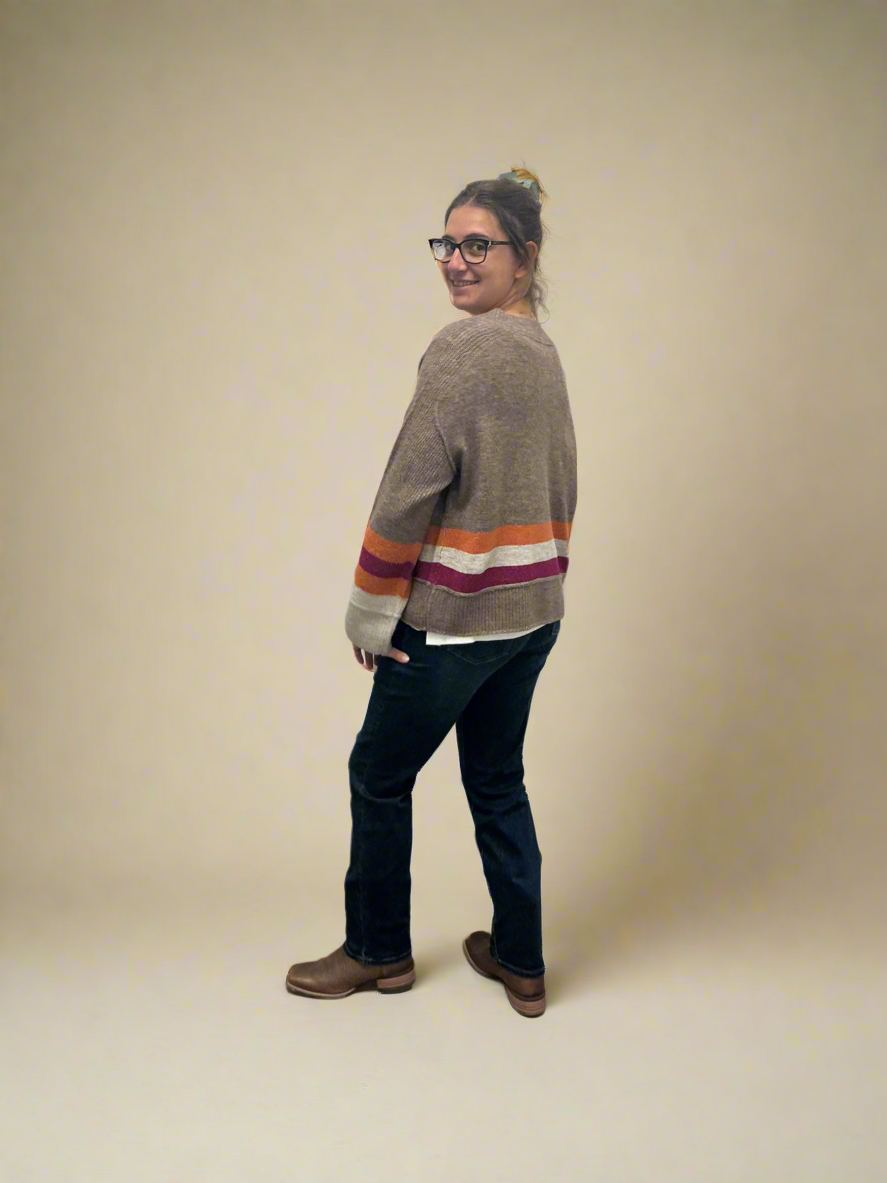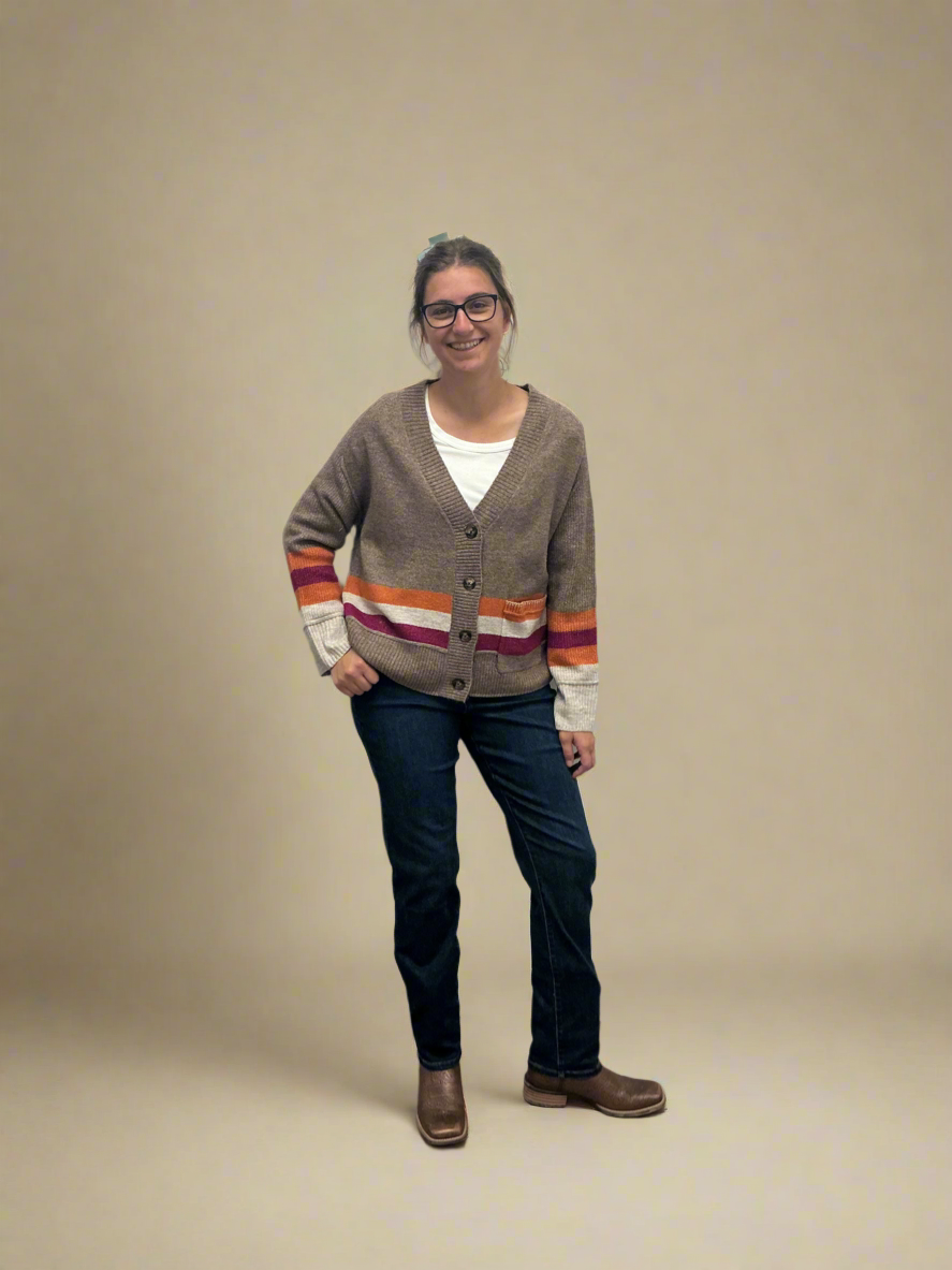 Cozy, creative, and effortlessly stylish – the soft knit V-neck cardigan is the layering piece every fall wardrobe needs. In a rich brown hue, it’s accented with playful, pink, orange and beige stripes along the hem and sleeves, giving it an artistic twist on a timeless classic. Designed with a relaxed, fit a single front pocket and easy button-down style. It’s perfect for layering over tees or dresses.