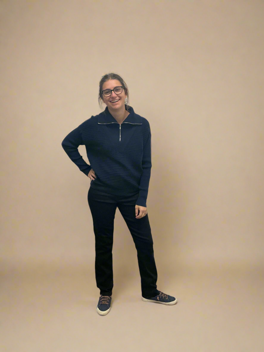 Embrace the cozy charm of fall with this navy ribbed sweater top, designed with comfort and timeless style in mind. Made from soft, breathable fabric, it features a collared V-neckline with a functional zip detail that lets you adjust your look from casual to refined. The subtle ribbed texture adds depth while keeping the fit flattering for everyday wear.