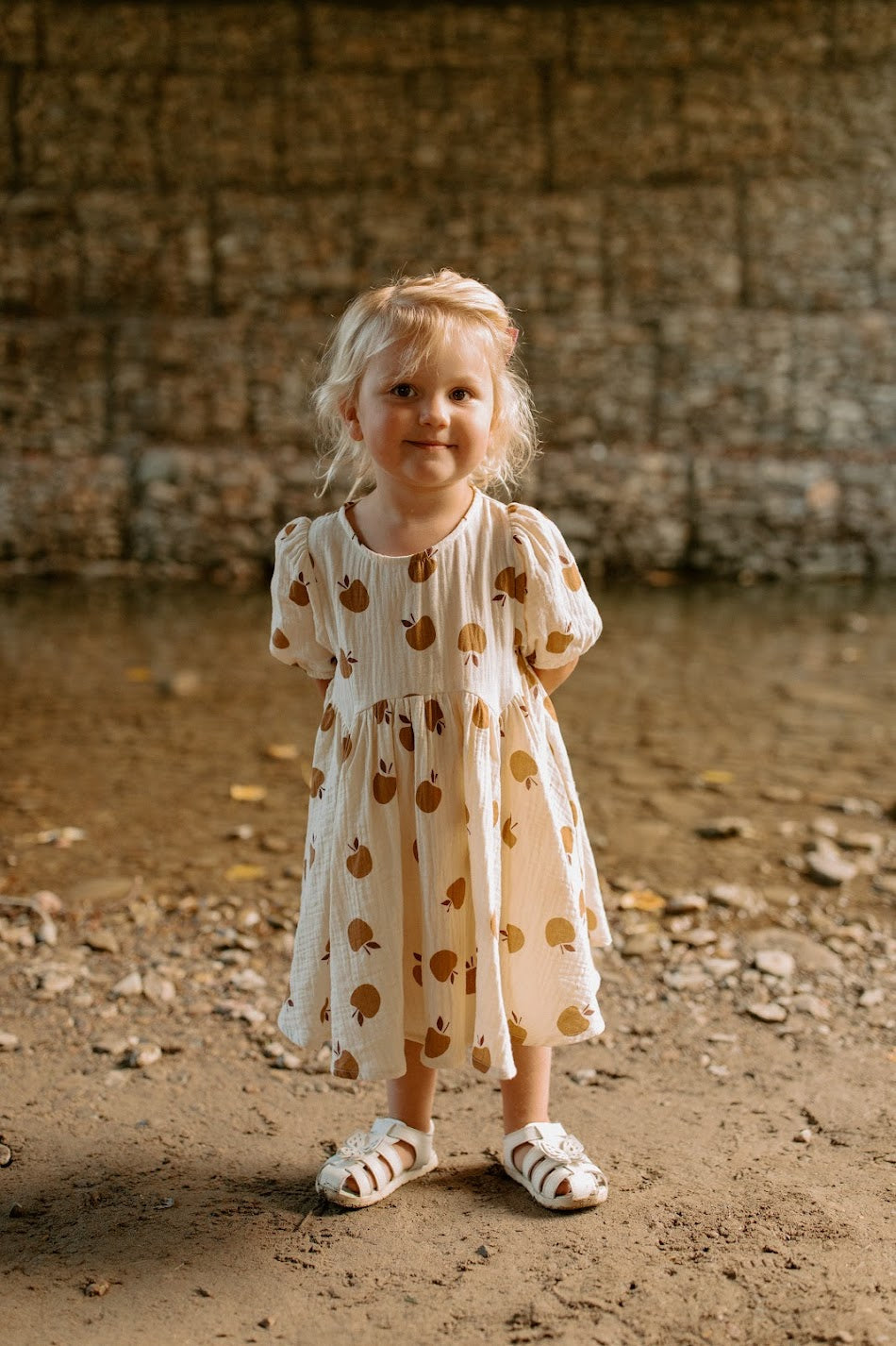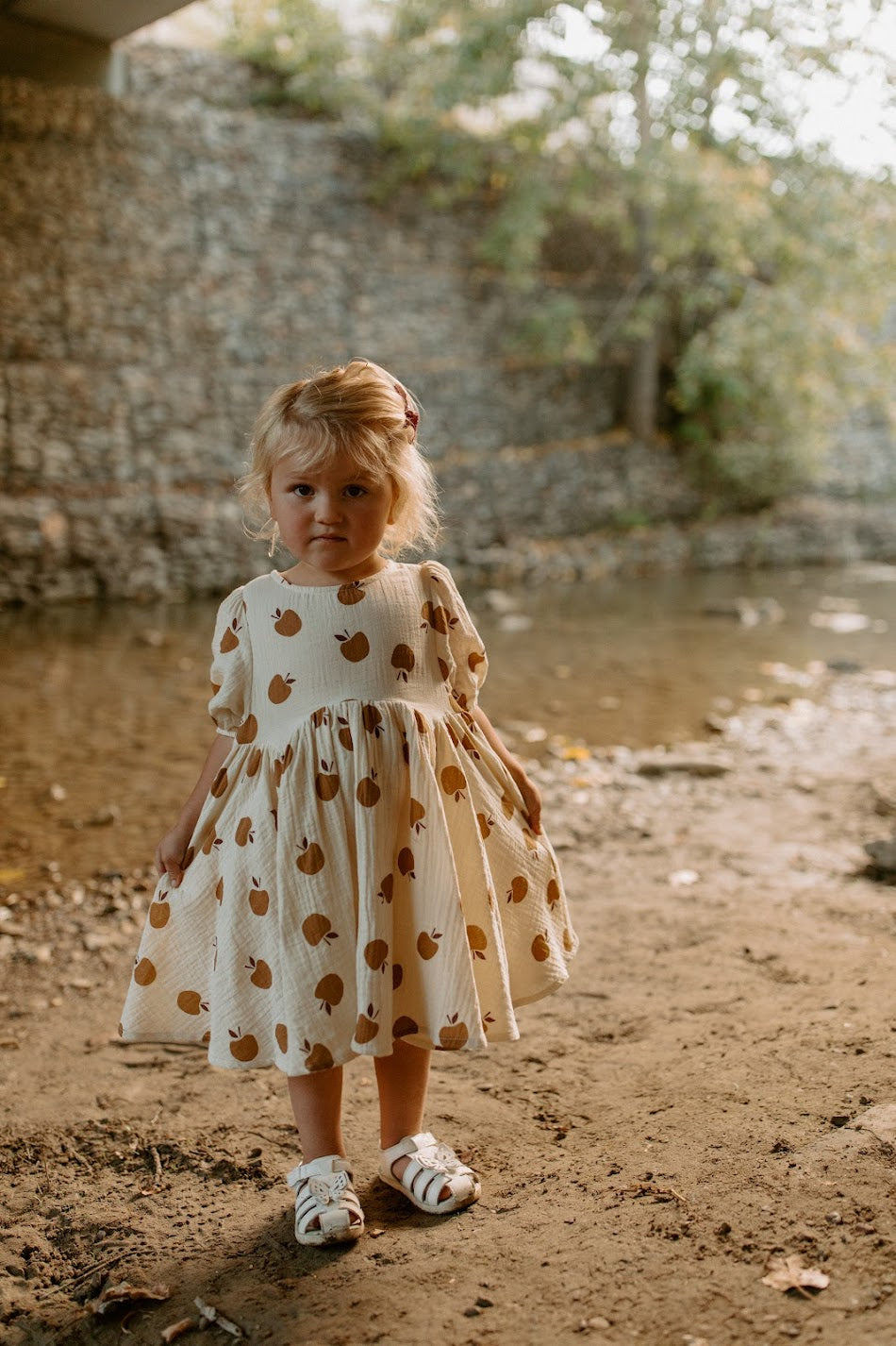 Made for crisp fall days, this darling dress is one every country mama will love! With a soft cream background sprinkled in a golden apple print, it’s as sweet as autumn itself. The gathered wassist and full skirt give her plenty of room to spin and play, while the puffed sleeves add a touch of timeless charm.