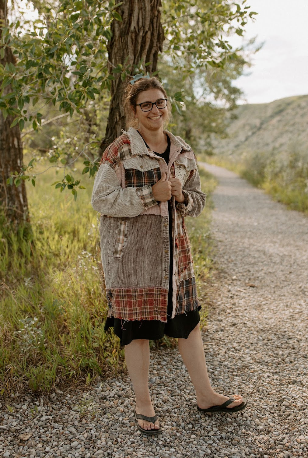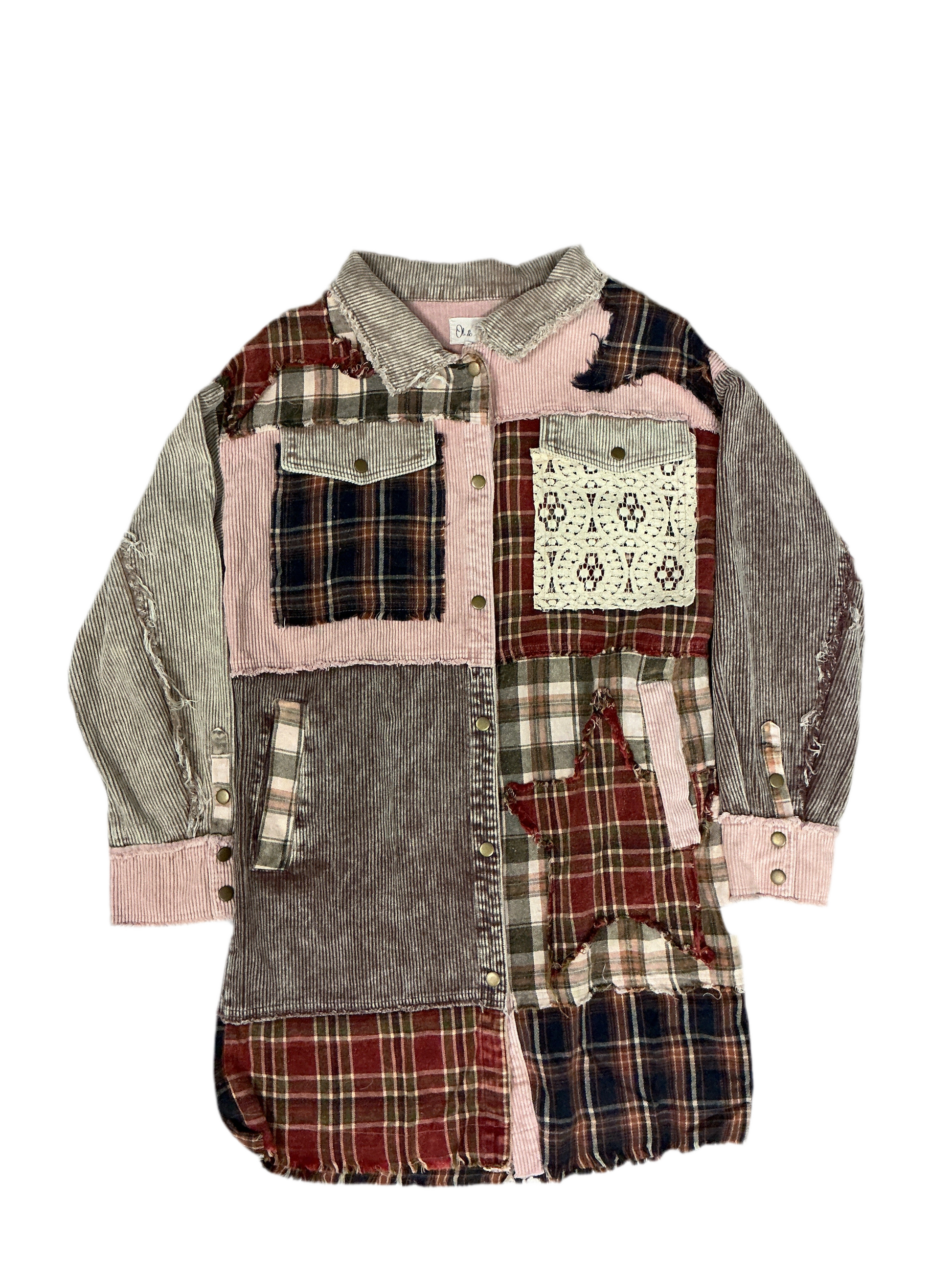 Cozy and unique, this long jacket blends soft corduroy with warm flannel in a charming patchwork design. Featuring brass snap buttons, a comfy collar, and convenient side pockets, it’s perfect for layering. Eye-catching details include one lace star, one lace pocket, and two additional flannel stars, adding a handmade, whimsical touch. A relaxed yet flattering fit makes this a standout piece for cooler days.