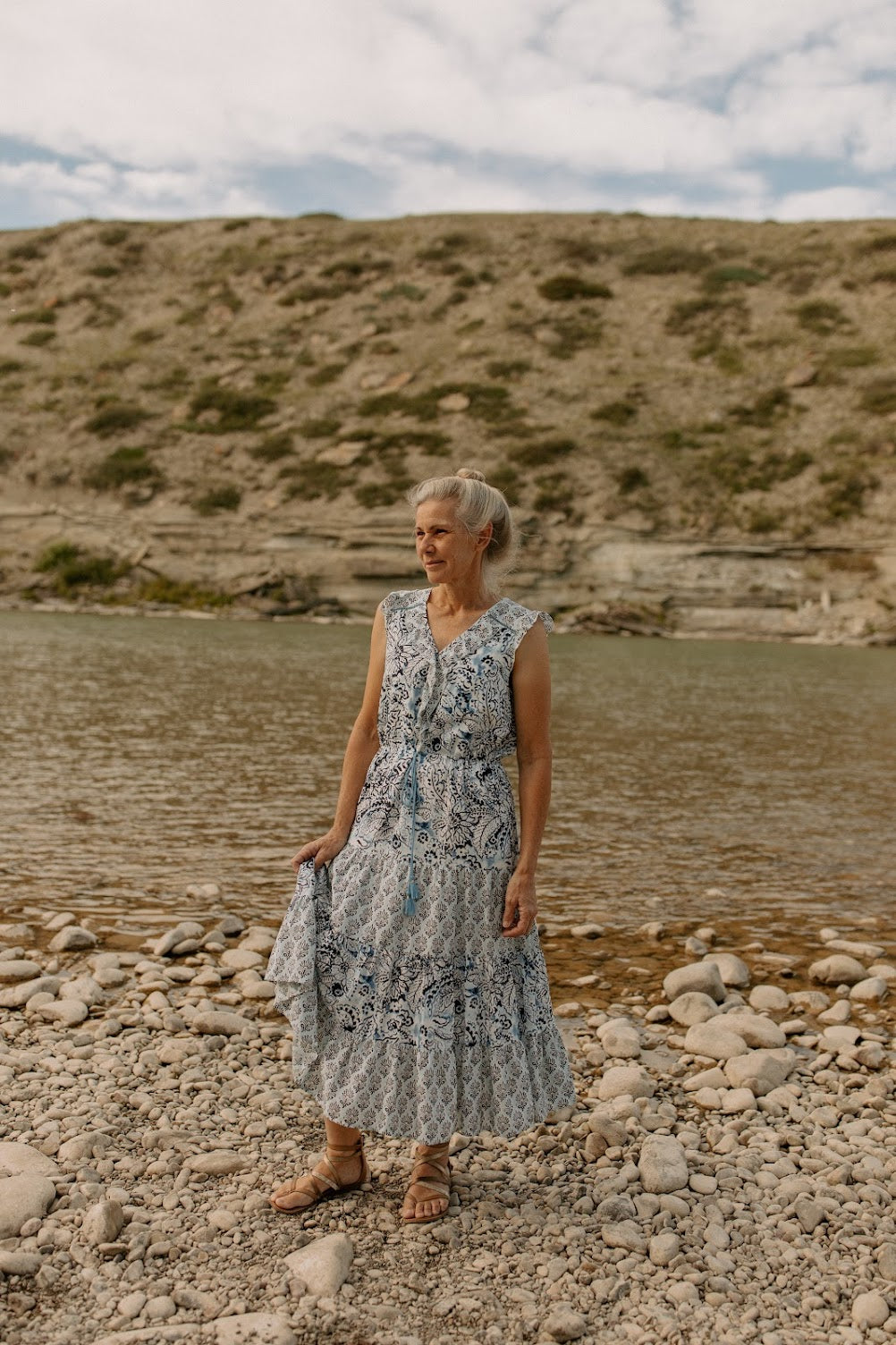 This beautiful tiered maxi dress from Tribal is most definitely a statement piece! Perfect for those days when you just feel a little extra glamorous! This dress comes with a tiered skirt, drawstring waist, v-neck, and ruffles on the front and sleeves as well as a maximalist navy and white floral print.