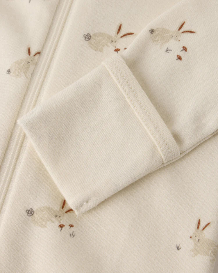 Sweet, simple, and oh-so-cozy - this unisex baby sleeper is created from organic brushed jersey that’s soft on delicate skin. With a pure white background and a whimsical bunny print, it brings just the right touch of country charm. The footed design keeps little toes warm on crisp fall days, while the breathable organic fabric gives health-minded mamas peace of mind. Perfect for naps, nighttime, or daily snuggling.